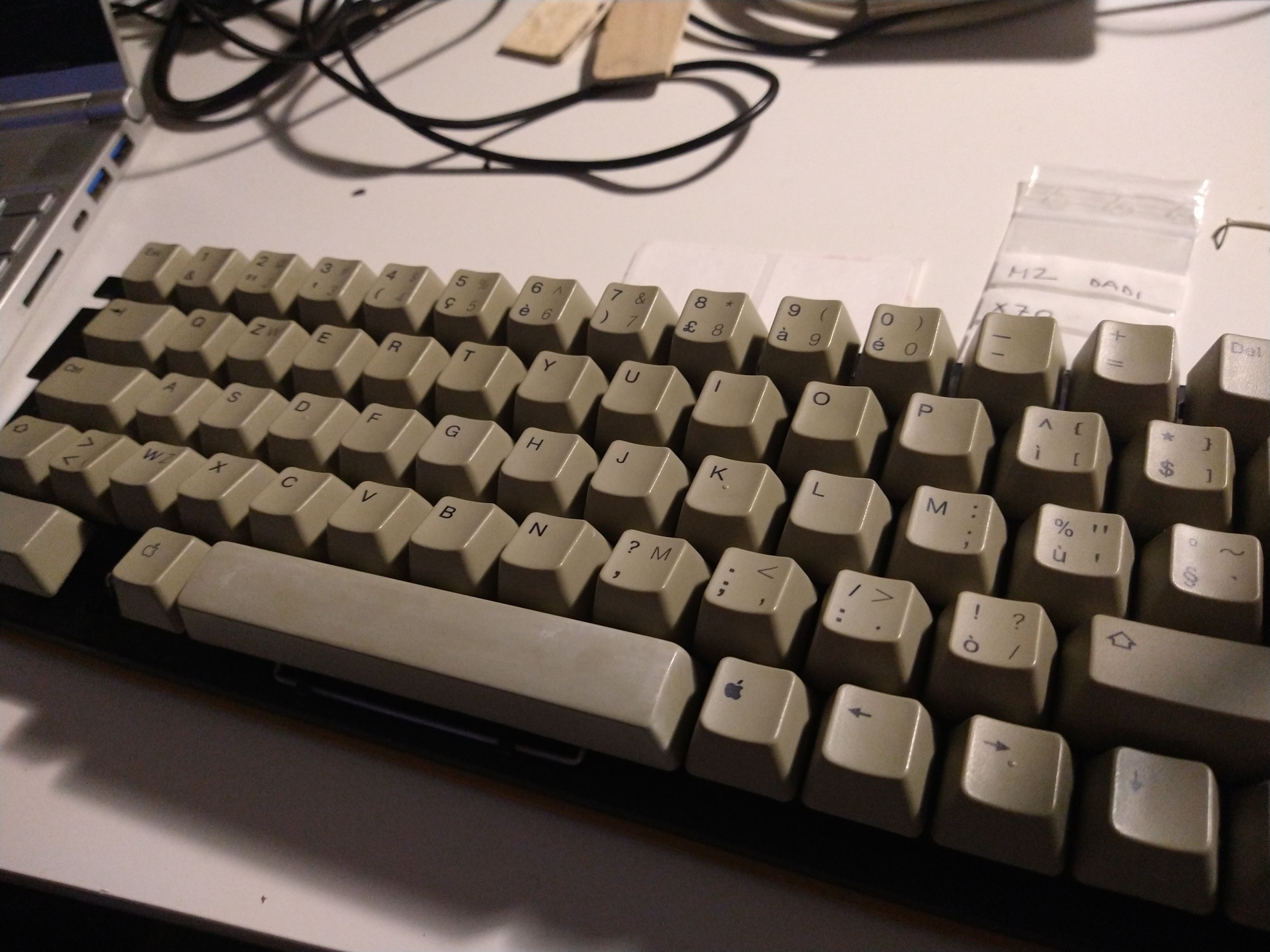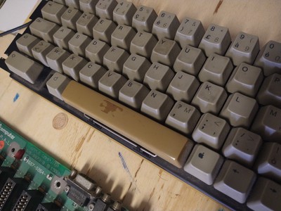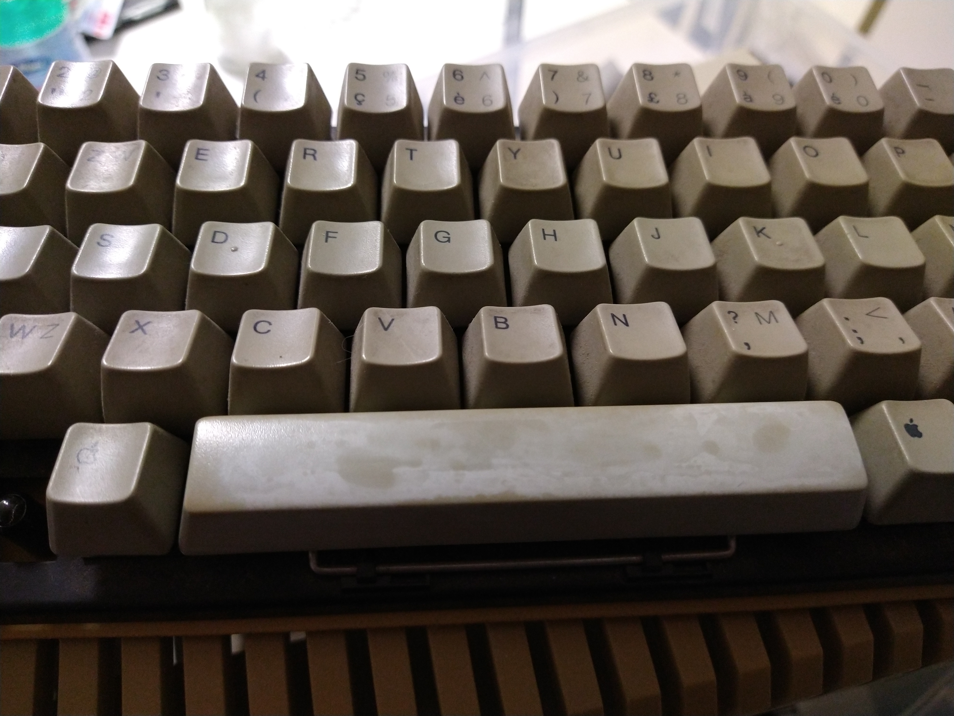 Lo stesso vale per i tasti, sciacquiati in bacinella e poi ripuliti uno ad uno. La barra spaziatrice era in condizioni peggiori, perché vi avevano incollato degli adesivi. Su questo singolo pezzo ho voluto sperimentare un retrobright a base di acqua ossigenata in crema. Secondo i pareri online, è sufficiente la crema sul pezzo, avvolgerlo in pellicola trasparente e esporlo ai raggi UV. Il risultato dopo una giornata al sole è stato insoddisfacente: il pezzo si era sbiancato, ma lasciando alcune chiazze qua e là, probabilmente dovute alla disuniformità con cui era stato avvolto nella pellicola. Ho voluto insistere con una seconda applicazione, stavolta usando una bustina in plastica al posto della pellicola. Non è venuto perfetto ma la disuniformità a leopardo si è ridotta. Però per evitare di far peggio che meglio mi sono accontentato così.